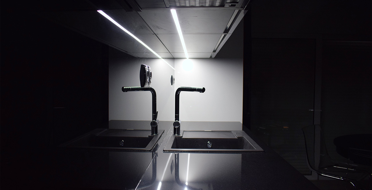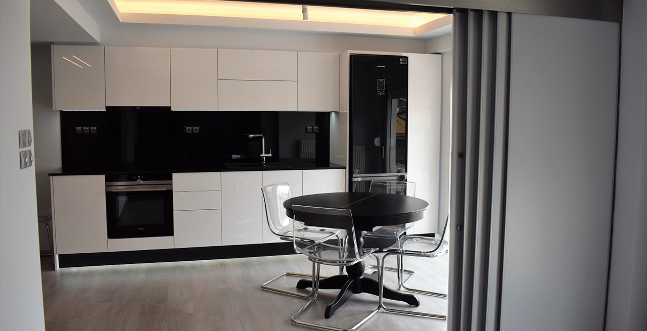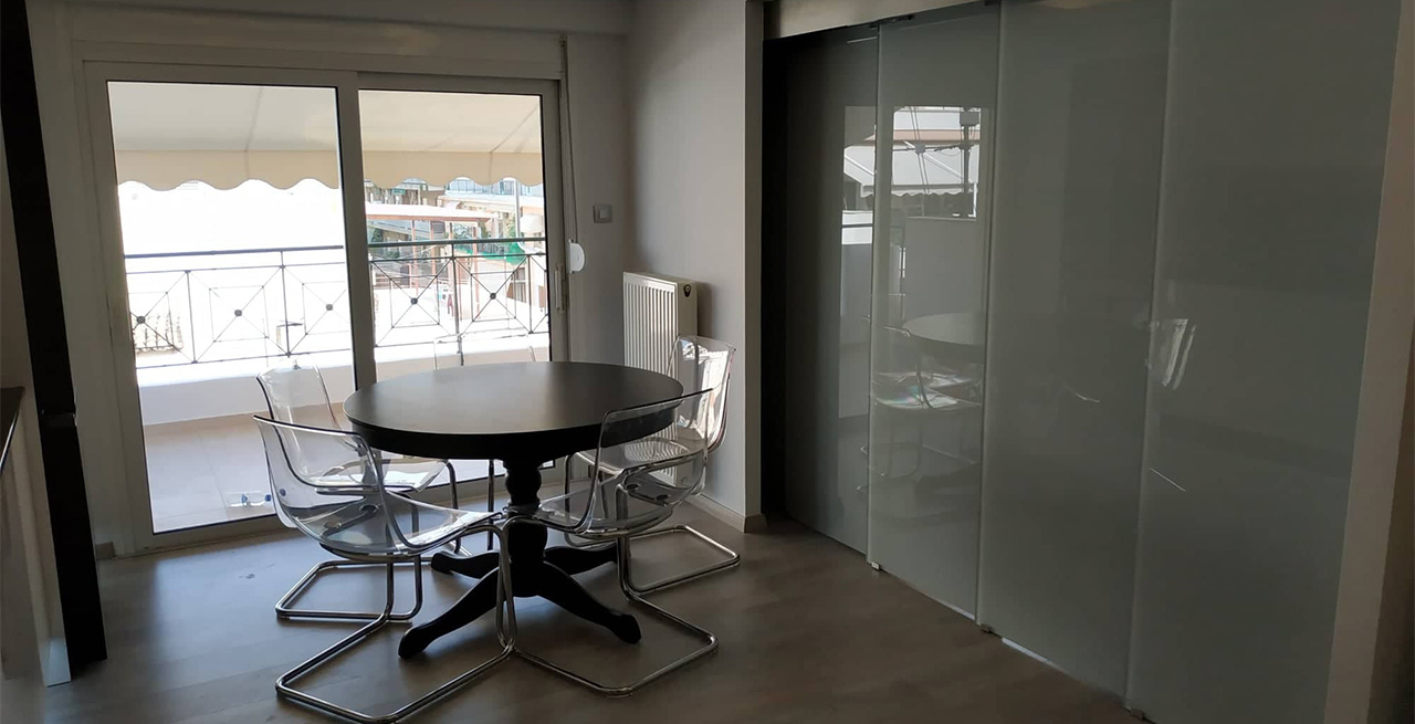 Ένα από τα πιο χαρακτηριστικά στοιχεία είναι η δημιουργία κινητού, χωνευτού γυάλινου διαχωριστικού μεταξύ κουζίνας και καθιστικού, που επιτρέπει τη διαμόρφωση χώρου φιλοξενίας χωρίς να επηρεάζεται η καθημερινή χρήση του υπολοίπου σπιτιού. Με αυτόν τον τρόπο, ο χώρος φιλοξενίας μπορεί να χρησιμοποιηθεί όποτε χρειάζεται, ενώ η ιδιωτικότητα και η άνεση του υπόλοιπου διαμερίσματος παραμένουν πλήρως διασφαλισμένες.