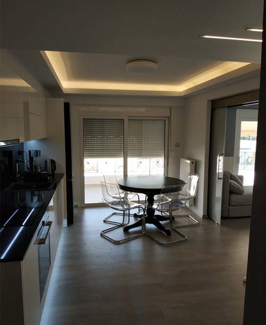 Πραγματοποιήθηκε πλήρης ανακαίνιση όλων των δικτύων θέρμανσης και ηλεκτρολογικών εγκαταστάσεων, ενώ τοποθετήθηκαν κλιματιστικές μονάδες υψηλής ενεργειακής απόδοσης, εξασφαλίζοντας άνεση και οικονομία. Παράλληλα, σχεδιάστηκαν κρυφοί περιμετρικοί φωτισμοί και ψευδοροφές, με στόχο να «εξαφανιστούν» οι χαμηλές δοκοί που υπήρχαν στον χώρο, δημιουργώντας αίσθηση μεγαλύτερου ύψους και καθαρών γραμμών. Η αισθητική του διαμερίσματος κινήθηκε σε μοντέρνα γραμμή, με χρήση υψηλής ποιότητας υλικών όπως ξύλο και μάρμαρο, που συνδυάζονται αρμονικά με τον φωτισμό LED, προσφέροντας έναν φωτεινό, κομψό και άνετο χώρο που συνδυάζει λειτουργικότητα, αισθητική και ευελιξία.
