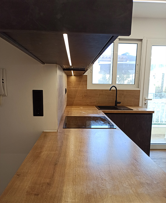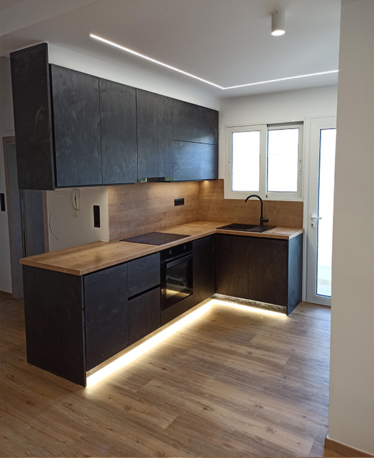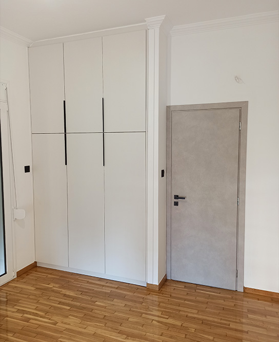Μέσα από τον επανασχεδιασμό της κάτοψης, διαμορφώθηκαν δύο άνετα υπνοδωμάτια, καλύπτοντας πλήρως τις ανάγκες μιας τετραμελούς οικογένειας. Η ανακαίνιση ακολούθησε μοντέρνα αισθητική, με ανοιχτές αποχρώσεις και χρήση φυσικών υλικών, όπως το ξύλο, που ενισχύουν τη φωτεινότητα και τη ζεστασιά του χώρου. Παράλληλα, πραγματοποιήθηκε ενεργειακή αναβάθμιση του διαμερίσματος με εγκατάσταση φυσικού αερίου, κλιματιστικών υψηλής ενεργειακής απόδοσης, ηλιακού θερμοσίφωνα και θερμοδιακοπτόμενων κουφωμάτων αλουμινίου. Ο φωτισμός αναβαθμίστηκε με την τοποθέτηση σύγχρονων συστημάτων φωτισμού LED, βελτιώνοντας τόσο τη λειτουργικότητα όσο και την αισθητική του χώρου. Η ανακαίνιση ολοκληρώθηκε με πλήρη αντικατάσταση των ηλεκτρολογικών και υδραυλικών εγκαταστάσεων, εξασφαλίζοντας άνεση, ασφάλεια και εξοικονόμηση ενέργειας σύμφωνα με τις σύγχρονες προδιαγραφές.